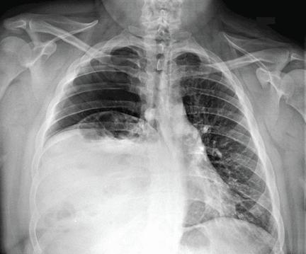Plain radiography shows a large right pneumothorax and an elevated right diaphragm.