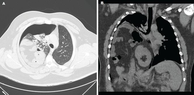 Thoracic computed tomography shows right anterior apical pneumothorax with atelectatic and hypoplastic lung in a cross-sectional view (A). A coronal view (B) shows significant elevation of the right hemidiaphragm, with fat, bowel, and kidney within the right hemithorax.