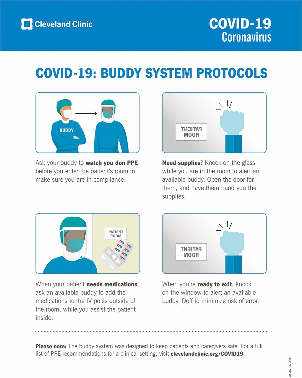 In addition, to reduce the high risk of transmission during the process of donning or doffing PPE, especially when doffing, we instituted a “buddy” system to create an additional layer of caregiver safety (Figure 1). This person provides direct observation and feedback during the process of donning and doffing PPE to ensure caregiver safety.